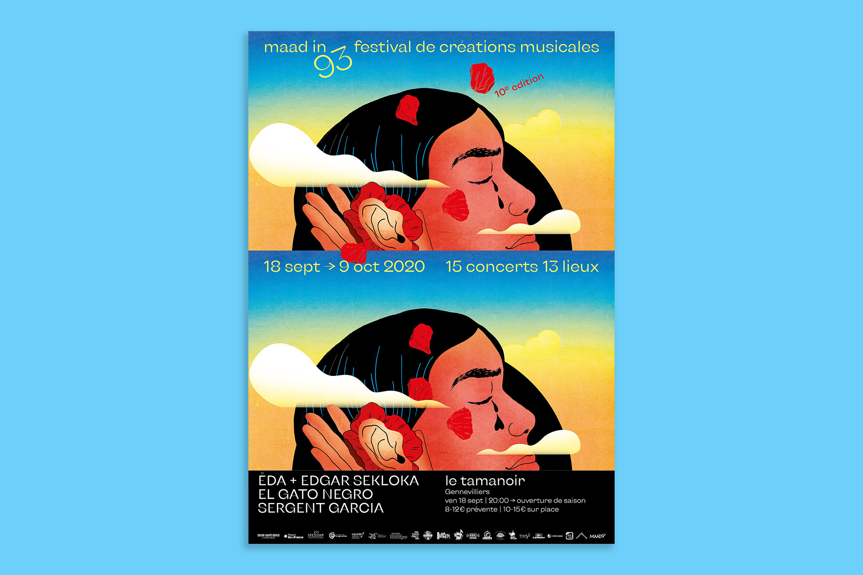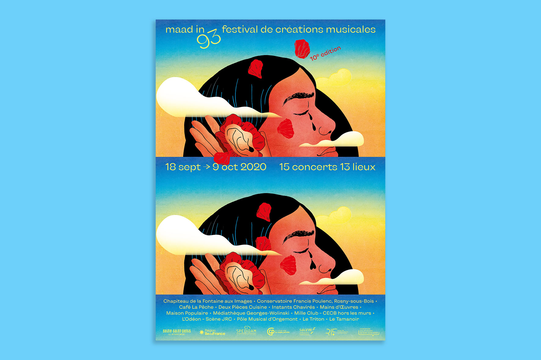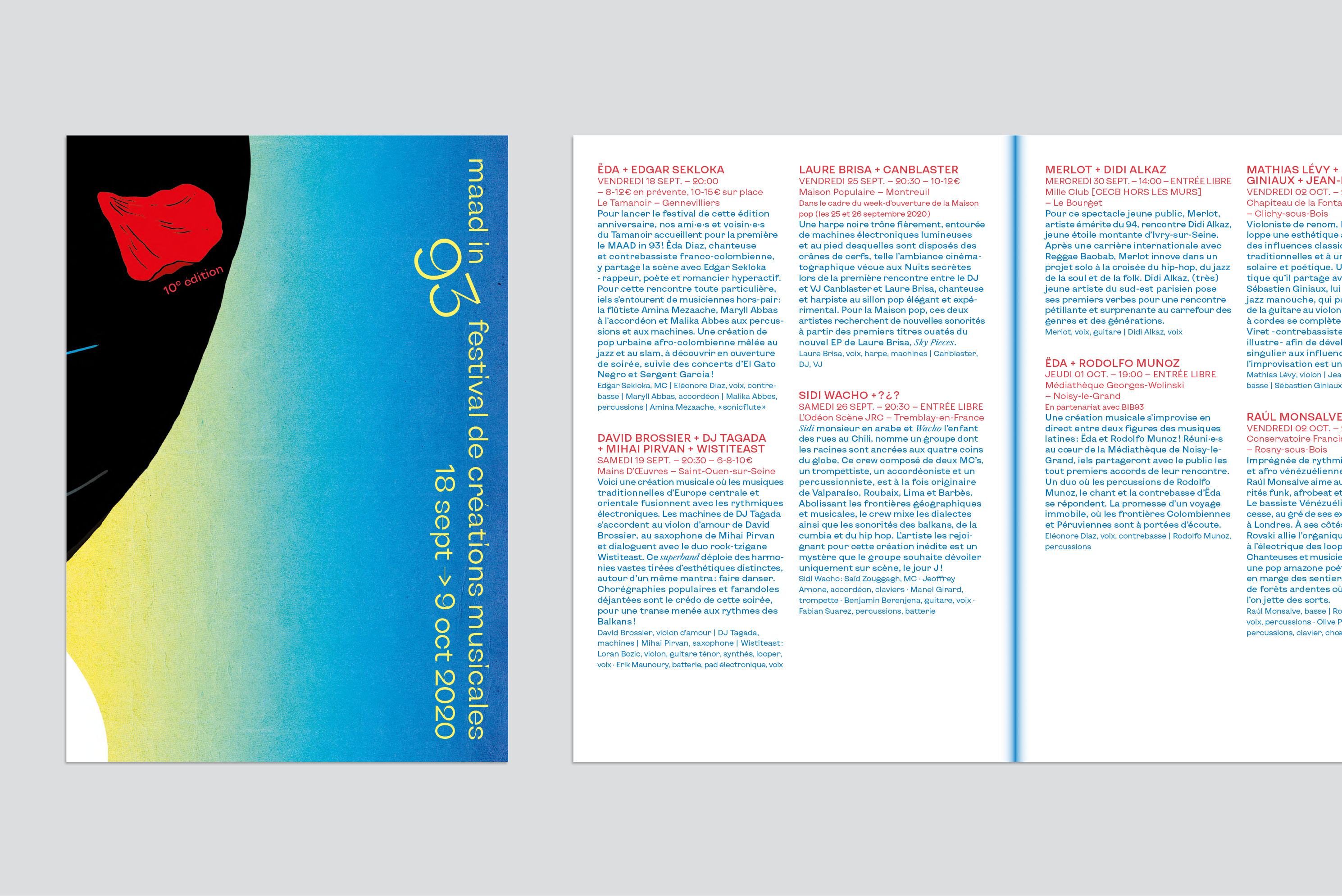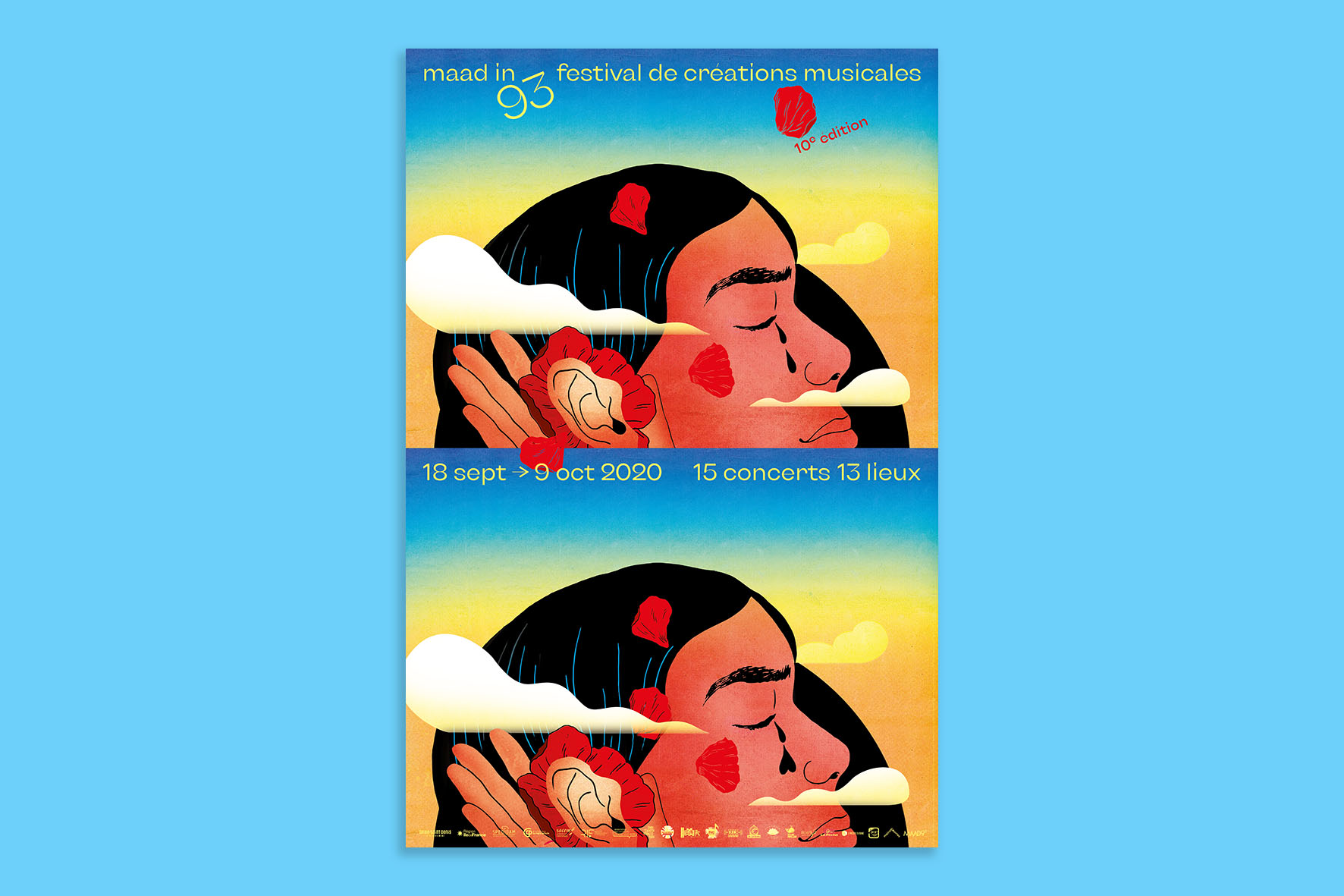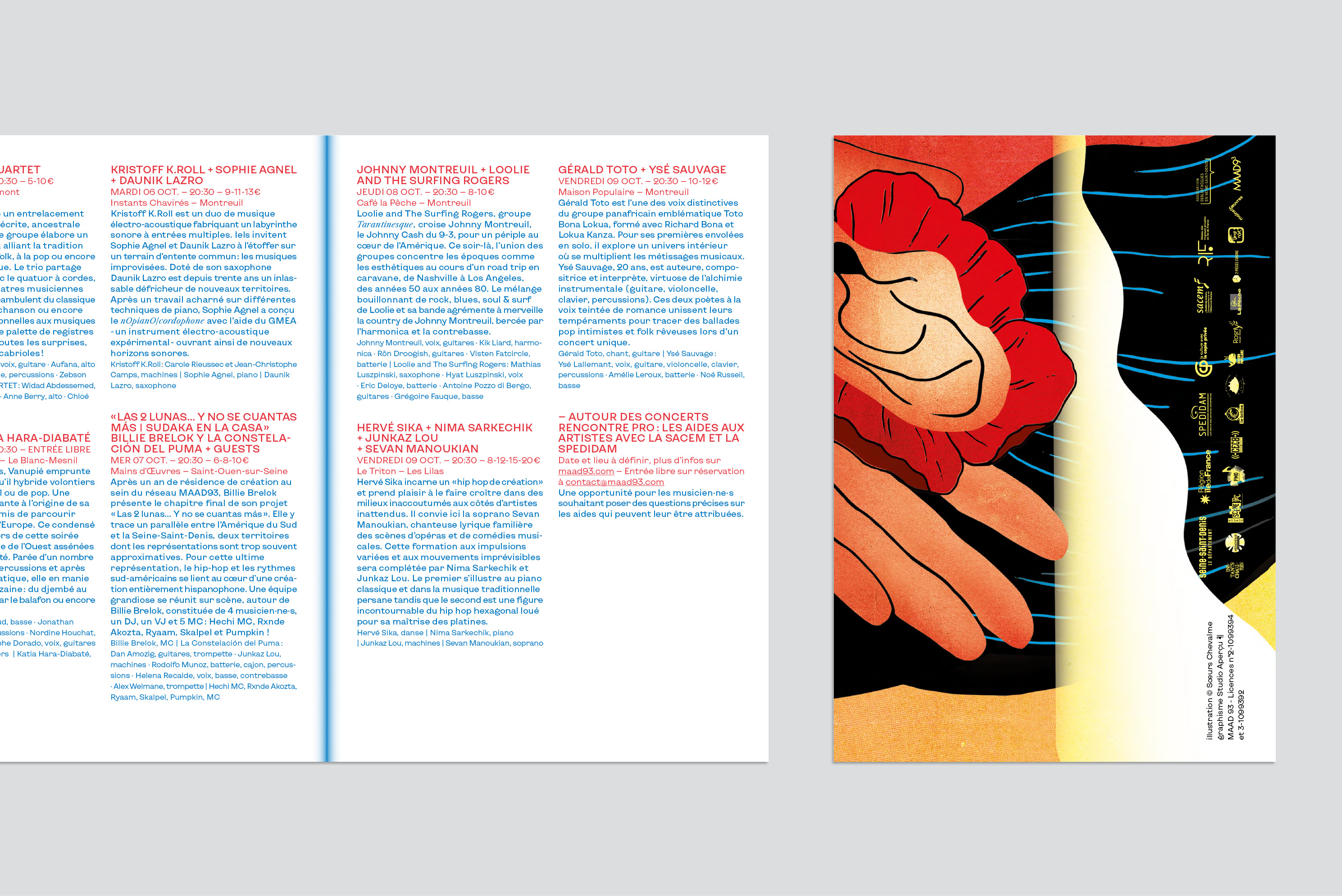 Création de l'identité visuelle, et déclinaisons. Affiches, programme, visuels web, visuels animés. Illustration des Sœurs Chevalme.hL’identité du festival de créations musicales Maad in 93 se redessine chaque année. Pour cette 10e édition, on navigue dans une illustration colorée et psychédélique, qui reflète la multiplicité des artistes invités.h
