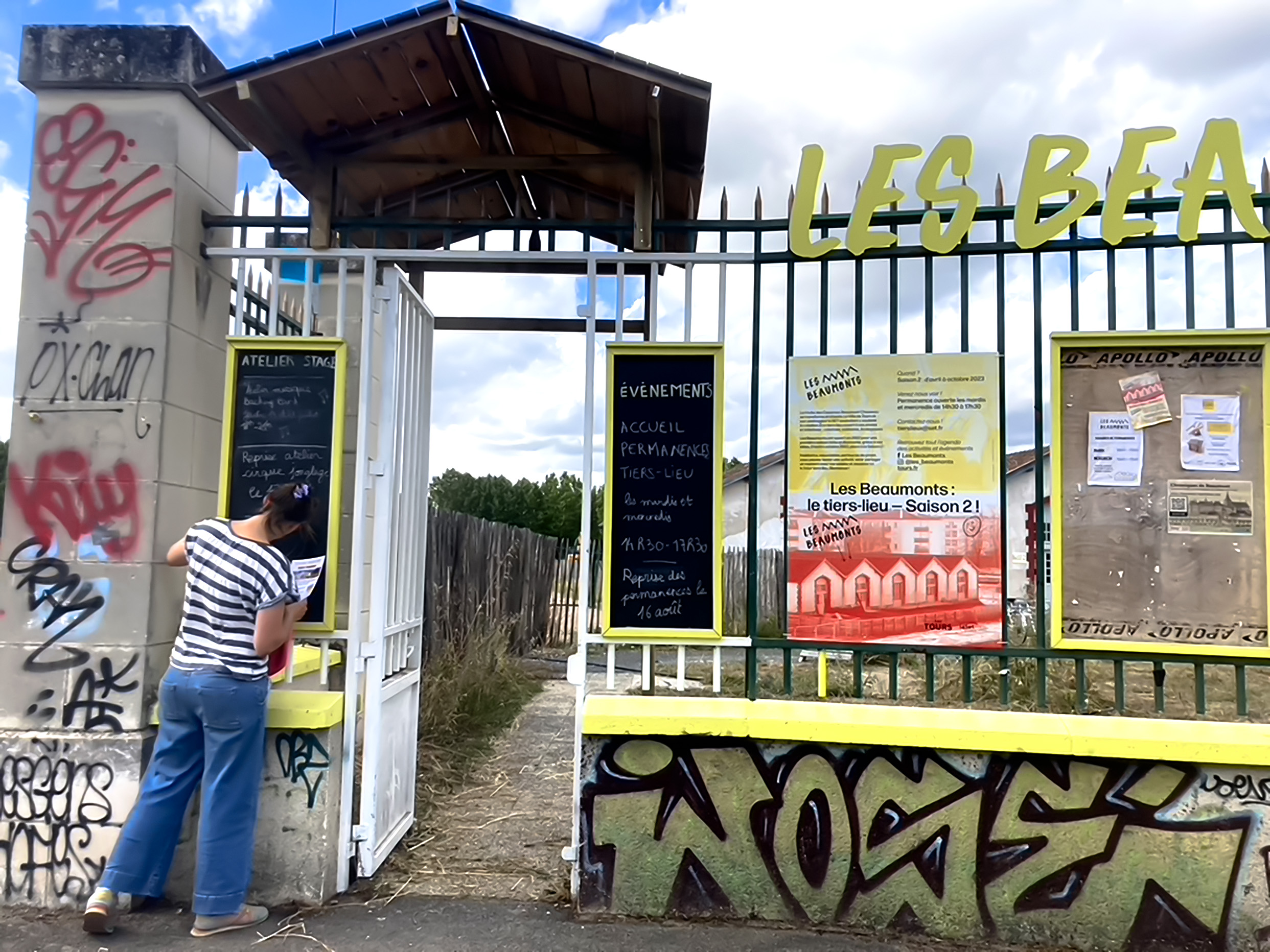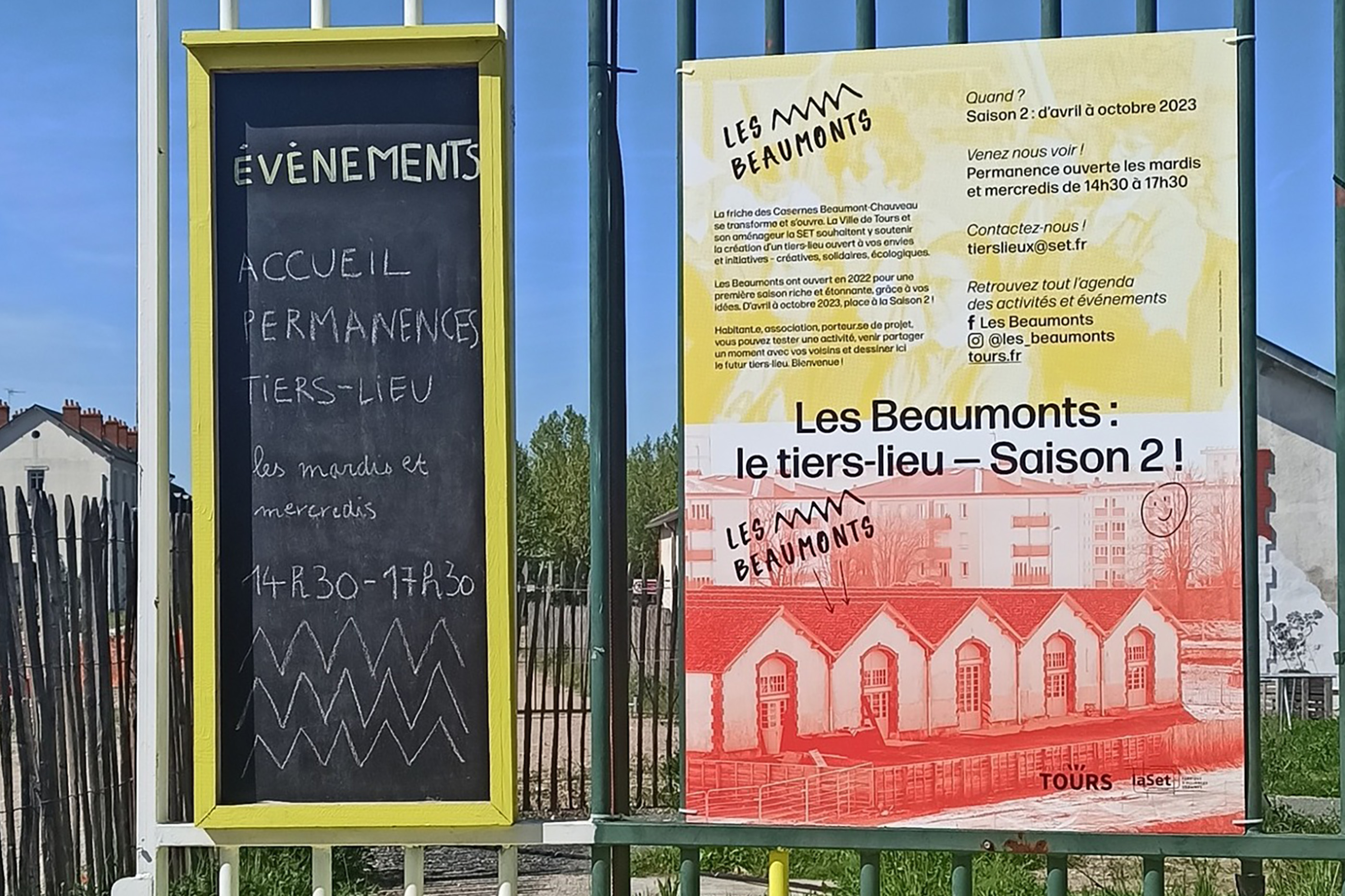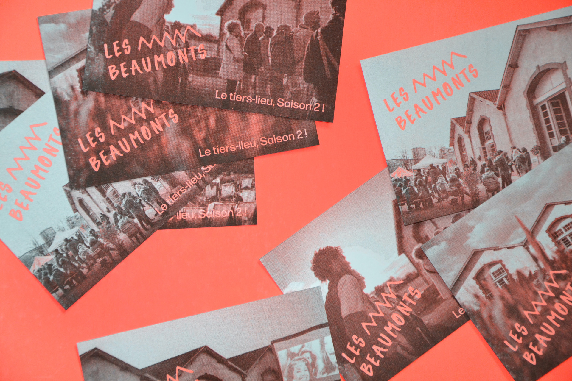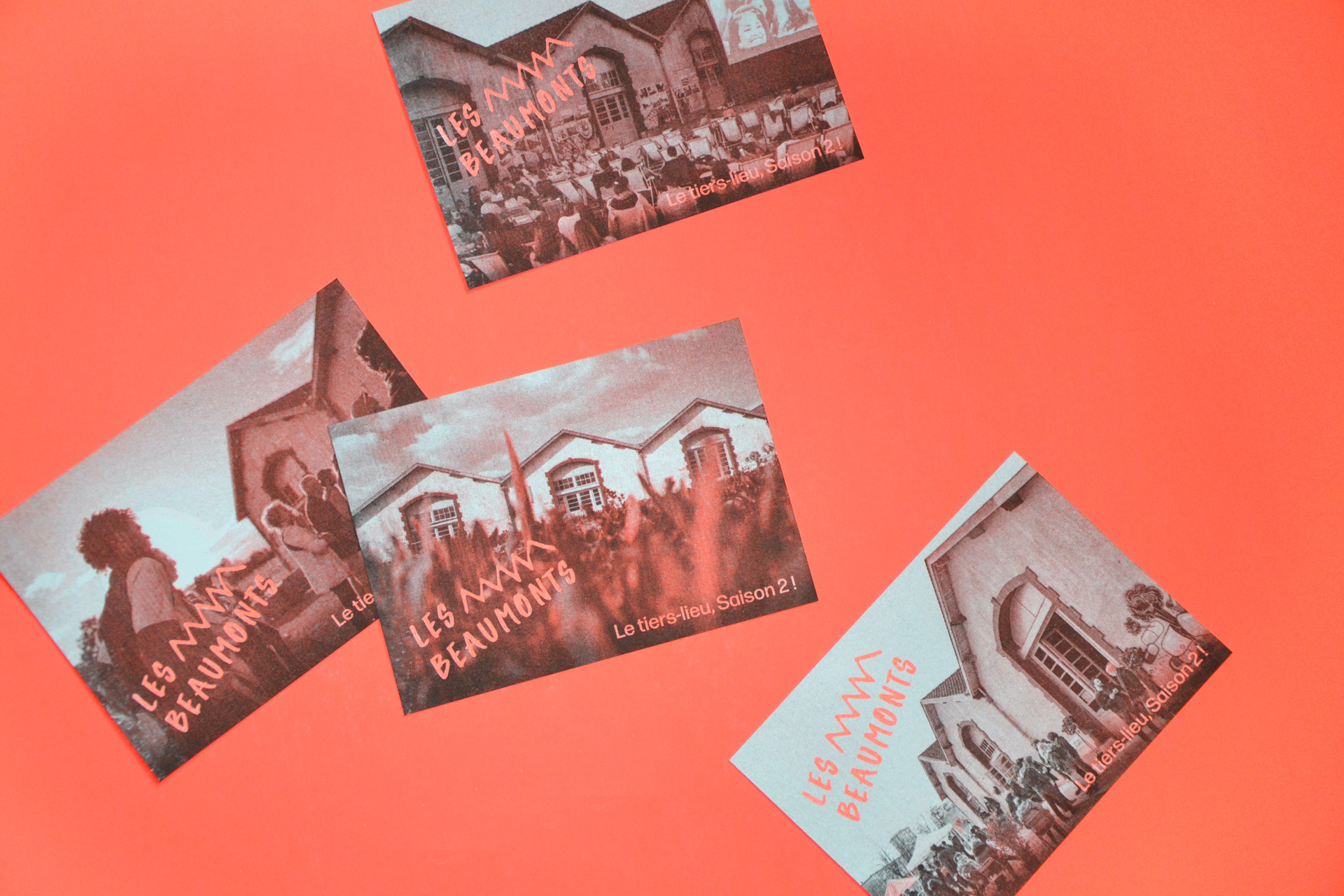 Création de l'identité visuelle.hLa ville de Tours et son aménageur la Set soutiennent la création d'un tiers-lieu sur la friche des casernes Beaumont-Chauveau. Est introduit un système graphique qui combine des vues du bâtiment, dont l'environnement est en constante transformation, et des vues du public qui fait vivre ce nouveau lieu, en moments festifs, réunions de quartier, ateliers bricolage... Les cartes riso sont imprimées en noir et orange fluo à la Fun Fabrique d'Usages Numériques à Tours. Photos François Lafite - Ville de Tours.h