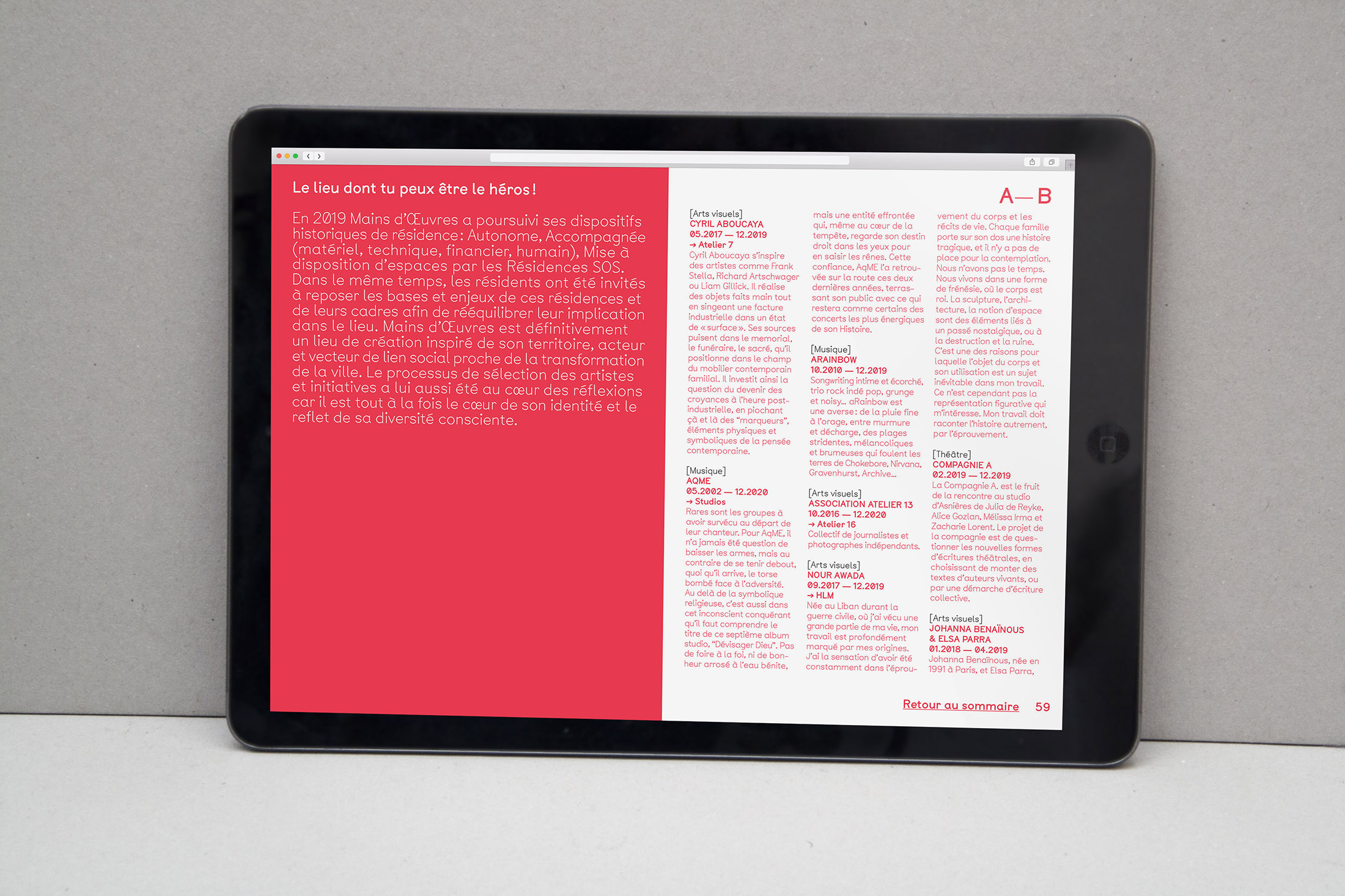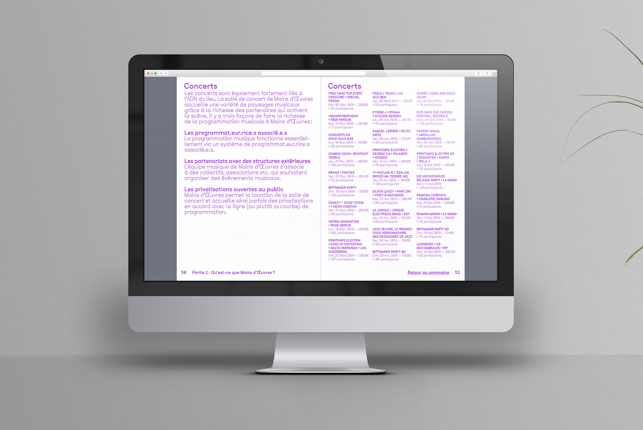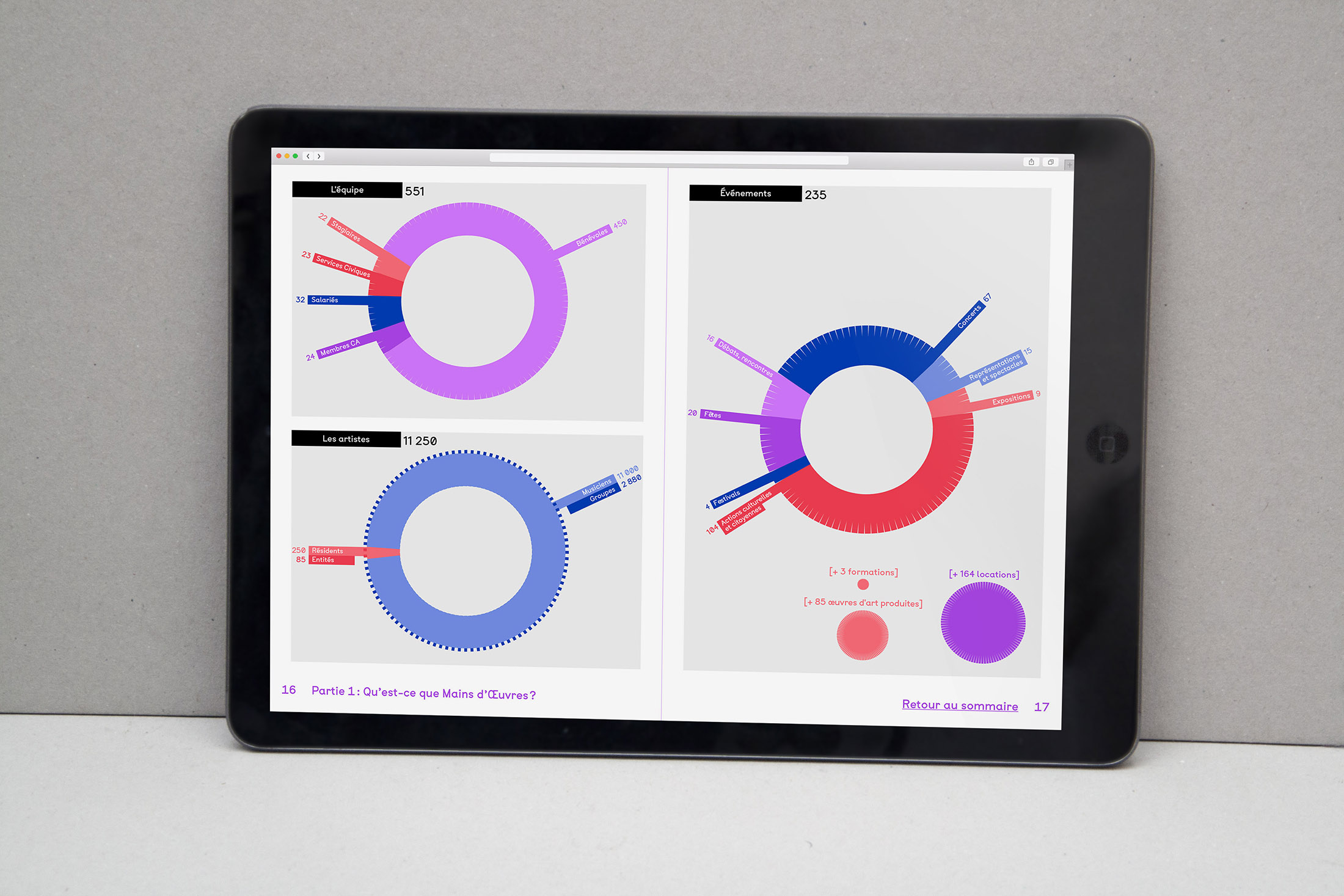 Création de la maquette et infographies.hL'année 2019 fut mouvementée pour Mains d'Œuvres, qui voit disparaître un financement important du fond social européen, et qui fait l'objet d'une expulsion forcée par la mairie en octobre. Malgré toutes ces péripéties, le tiers-lieu emblématique de Saint-Ouen a réussi à survivre, grâce à la mobilisation de l'équipe, des artistes, des habitants, et grâce au soutien exceptionnel de ses partenaires et financeurs. Pour raconter cette année 2019, une maquette haute en couleurs, la part belle aux photographies des résidents, et des infographies sur mesure.h