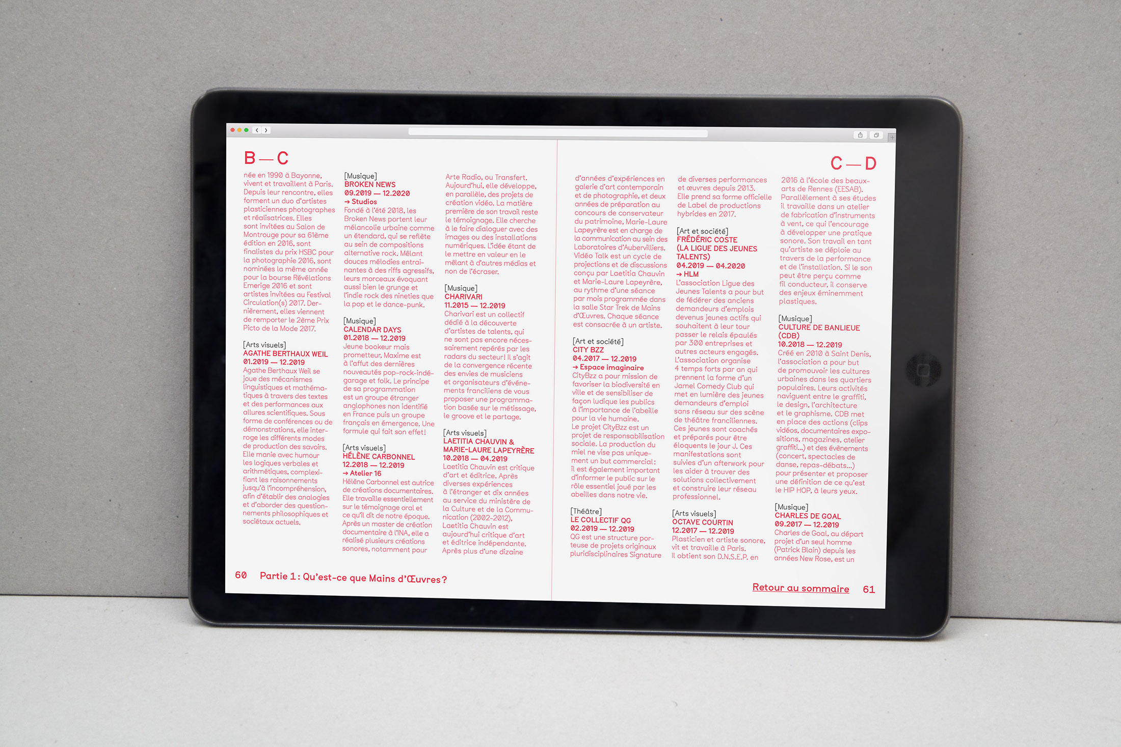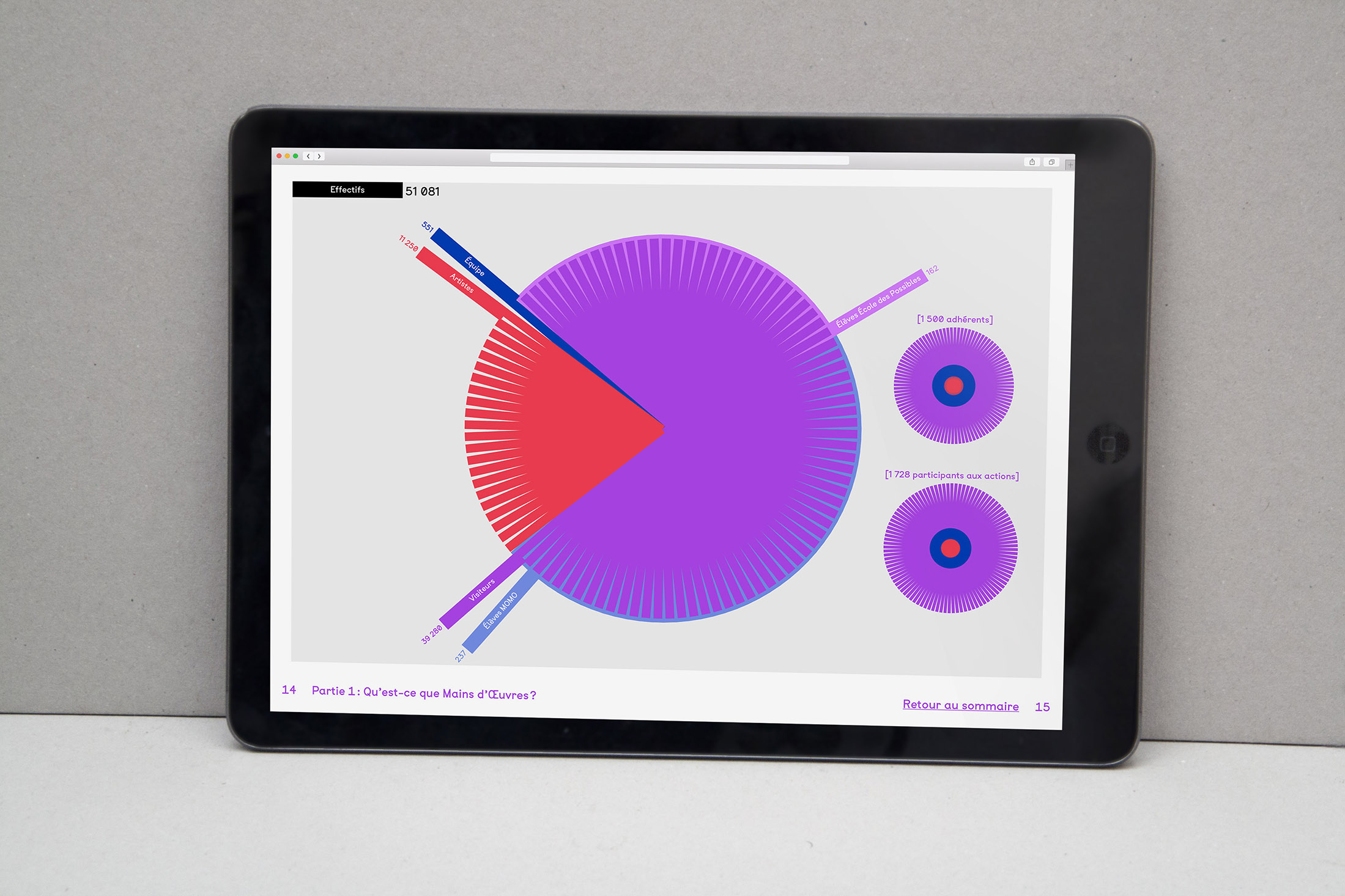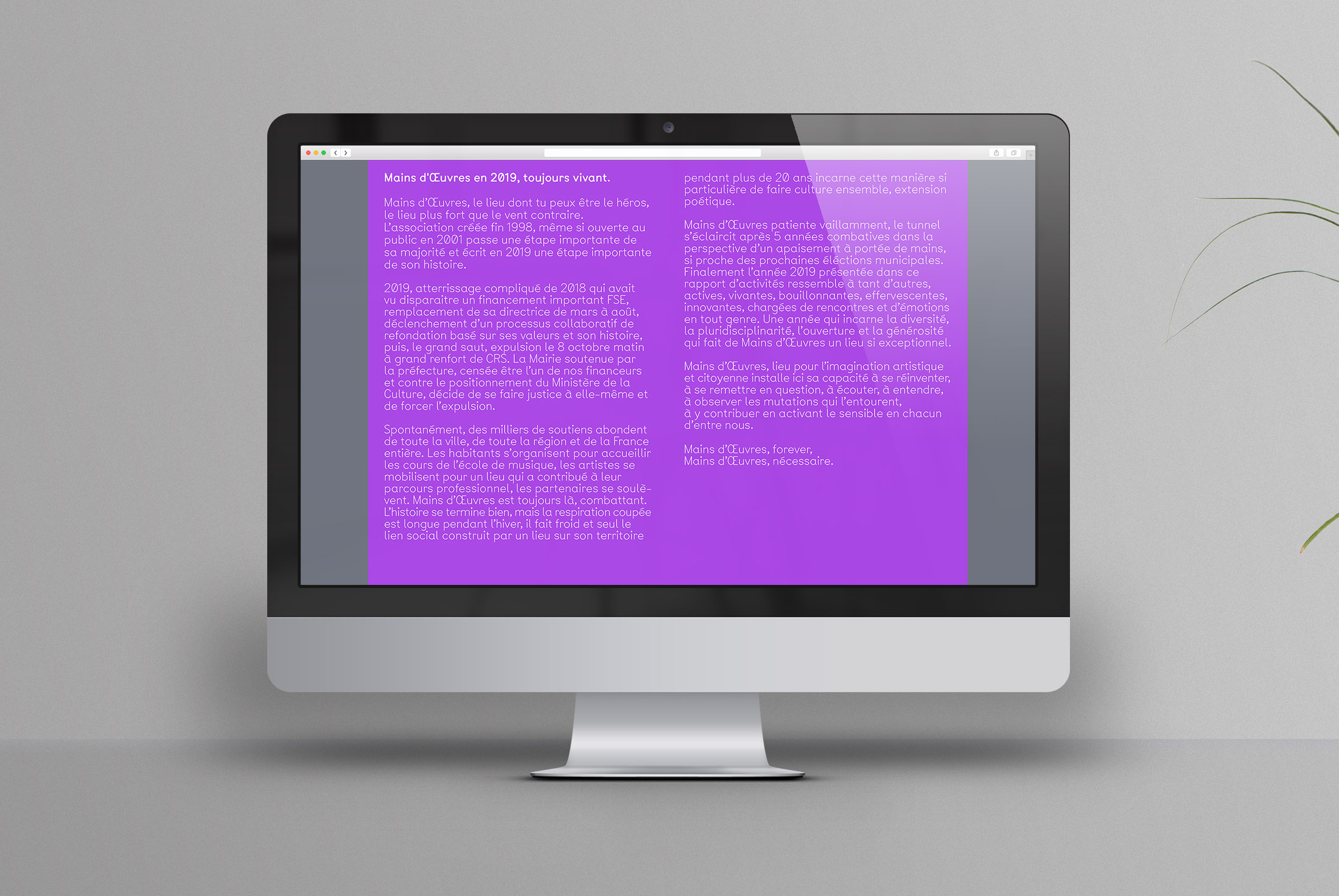 Création de la maquette et infographies.hL'année 2019 fut mouvementée pour Mains d'Œuvres, qui voit disparaître un financement important du fond social européen, et qui fait l'objet d'une expulsion forcée par la mairie en octobre. Malgré toutes ces péripéties, le tiers-lieu emblématique de Saint-Ouen a réussi à survivre, grâce à la mobilisation de l'équipe, des artistes, des habitants, et grâce au soutien exceptionnel de ses partenaires et financeurs. Pour raconter cette année 2019, une maquette haute en couleurs, la part belle aux photographies des résidents, et des infographies sur mesure.h